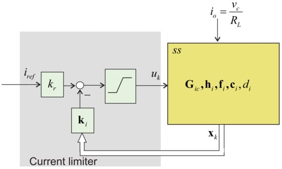 For the current limiter design, the current condition is represented by a load resistance . The discrete-time model presented in (1) and (2) is then rewritten in (3) and (4), with the block diagram of the current loop controller shown in Figure 7.