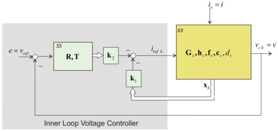 Considering the single-phase circuit shown in Figure 4, a discrete-time state–space model with a sampling time of , including the one-sample delay resulting from the digital implementation for the output voltage controller, is given by (10) and is rewritten in the compact form in (11).