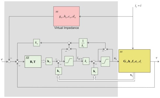 For the Thevenin equivalent of the virtual impedance implementation, the block diagram in Figure 9 is considered. Since the continuous-time virtual impedance is non-causal, a pole must be introduced to make it causal. Any discretization method for solving ordinary differential equations can be applied; however, to simplify the state–space model, Euler’s discretization method is chosen. By applying Euler’s method with a sampling period , the discrete-time representation is obtained in (23) and (24) and is represented in state–space form in (25) and (26).