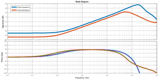 For comparison purposes, Figure 13 presents the virtual impedance and virtual admittance plotted at the same bode diagram. It can be observed that the magnitude and phase of the inverter with virtual impedance and admittance are similar below and around the grid nominal frequency, which in this case is 60 Hz.
