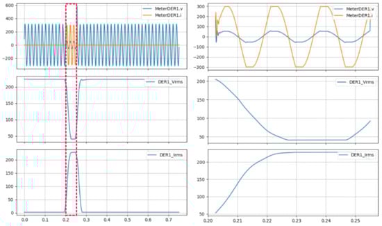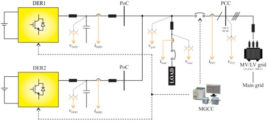 To evaluate and compare the performance of the different internal controllers described in the previous subsections, a case study must be defined: a microgrid consisting of two identical DERs that share a linear resistive load, as presented in Figure 14. The Microgrid Central Controller (MGCC) sends active and reactive power set-points to the DERs. Each DER incorporates inner current loops, virtual impedance, and Droop control as primary control strategies [6]. For comparison purposes, results were obtained operating with virtual inductance (Figure 15) and virtual admittance (Figure 16). It is observed that both strategies result in similar waveforms; however, the Norton equivalent with virtual admittance shows a higher output current measurement during the 0.05 s short circuit.