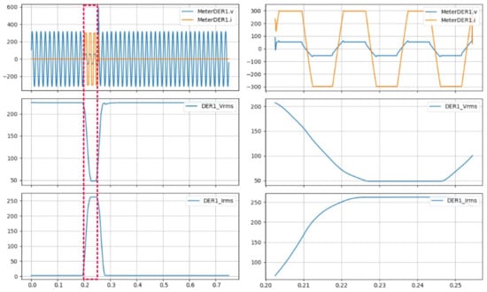 HIL simulation results showing the voltage and current measurements of a DER operating in parallel during a 0.05 s short circuit with the inductive Droop as primary controller and predominantly inductive virtual inductance.