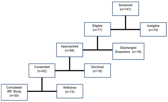 Medical charts from 149 admitted stroke survivors were screened for study eligibility by a member of the research team (Figure 1). Inclusion criteria included unilateral stroke within the last 30 days, age ≥ 18 years old, and English language speaking. Exclusion criteria included inability to give informed consent or follow two-stage instructions, severe cognitive impairment indicated by a score ≤9 on the Montreal Cognitive Assessment (MoCA), or concurrent illness or injury limiting the capacity to conform to study requirements. Of the participants screened using electronic health records, 77 were eligible for the study. Eligibility and intent to approach for consent was then acknowledged with the patient’s attending physician. Of those eligible, 58 participants were approached by a study team member to describe the study along with its potential risks, whereas the remaining 19 were discharged home or to an outside facility. For those who expressed interest, a study team member administered the MoCA to confirm cognitive eligibility prior to conducting informed consent. The 42 participants who expressed interest all satisfied the cognitive screening criteria and provided written, informed consent to participate in this study. All participants were recruited within an 8-month period for an overall recruitment rate (number of participants consented/months recruiting) of 5.25 participants/month.