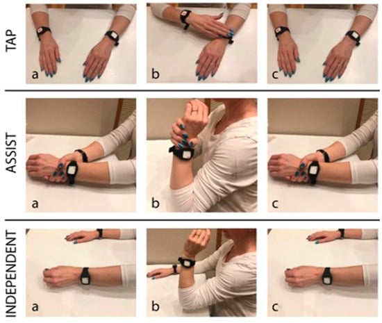 Progressive challenge exercise program ranging from easiest (tapping; top) to more challenging (independent; bottom): (1) tap—the user simply draws their attention to the MI side by tapping their MI arm with their LI hand, (2) assist—the user guides their MI elbow through its full flexion and extension range of motion using their LI hand for support, or (3) independent—the user performs independent active elbow flexion and extension on their MI side without assistance from the LI arm and hand [27]. Labels a through c indicate the temporal order of actions for each exercise.