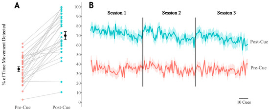 (A) Paired average response rates across days for each participant. Pre-cue includes the 5 s of activity prior to cue delivery, and post-cue includes the 5 s following cue delivery. Black dots and lines indicate the overall mean and SEM. (B) Average response rates across all days within all participants for cues 1 through 180. See Supplementary Materials for supporting data tables (S4).