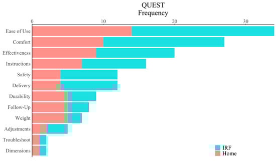 Categories of the Quebec User Experience and Satisfaction with Assistive Technology (QUEST) users identified as most important for promoting a positive user experience. Ease of use, comfort, and effectiveness were identified most frequently out of the categories in both the IRF and home settings. See Supplementary Materials for supporting data tables (S4).
