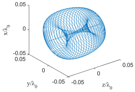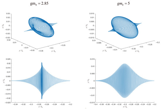 Through testing, it was found that when the normalized initial energy of the electron is increased to , the electron does not undergo reversal. Its axial velocity reaches 0, while the radial radius continues to change under the influence of the pulse, resulting in a trajectory envelope with a radial ring-shaped protrusion in the middle, resembling a gong shape. As the electron’s initial energy continues to increase, the deceleration of radial motion becomes less noticeable, and the trajectory exhibits the typical spindle shape. For example, at , the trajectory appears as shown in Figure 5. Therefore, the above analysis and conclusions are verified to be correct.