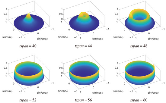 Figure 6 shows the changes in the radiation spatial distribution shape during the electron’s motion process, with taken from 40 to 60. Since we are only focused on the change in the radiation shape during the interaction process, the maximum value of the radiation is normalized for easier observation of the change in the electron’s radiation shape. From the figure, it can be seen that during the first phase of the electron’s motion, the radiation shape changes from a peak to a vortex and then to a ring. This is due to the increasing amplitude of the laser pulse and the decreasing beam waist radius over time, which enhances the laser pulse’s confinement effect on the electron, making the radiation distribution more compact. The thickness of the high-radiation ring decreases, and the radius of the radiation ring increases as the laser pulse amplitude increases, resulting in changes in the observed shape distribution of the radiation.