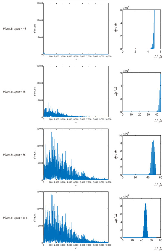 At the same time, we independently calculate and plot the time–frequency spectra for the four stages and study the detailed analysis of the radiation power. The time spectrum and frequency spectrum of the radiation for the four stages are shown in Figure 7.