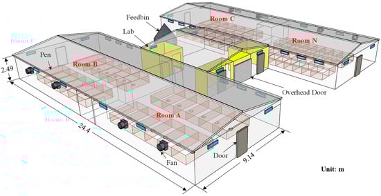 This study was conducted in a pig farrowing–nursery research building, situated at the Purdue University Animal Sciences Research and Education Center (ASREC), West Lafayette, Indiana, USA. This facility comprises three farrowing rooms (Rooms A, B, and C) and one nursery room (Figure 1). Each farrowing room is 12.2 m (L) × 9.1 m (W) × 2.5 m (H) and contains 12 farrowing pens, each measuring 2.6 m (L) × 1.5 m (W), with tribar metal flooring. Each room has one door leading outside and another connected to the center hallway. Rooms A and B are connected by a door and were used in this study.