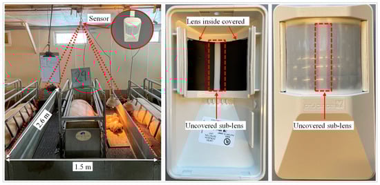 The sensor lens consists of 36 sub-lenses or beams and covers a 90 wide angle. To restrict the sensor detection range (length and width) to the dimension of a single pen of 2.6 m (L) × 1.5 m (W), the sensor was strategically mounted on the ceiling (2.2 m above the floor) at the sow’s tail-end in each pen and tilted downward at 50°. This setup constrained the sensor detection length to 2.6 m (Figure 2).