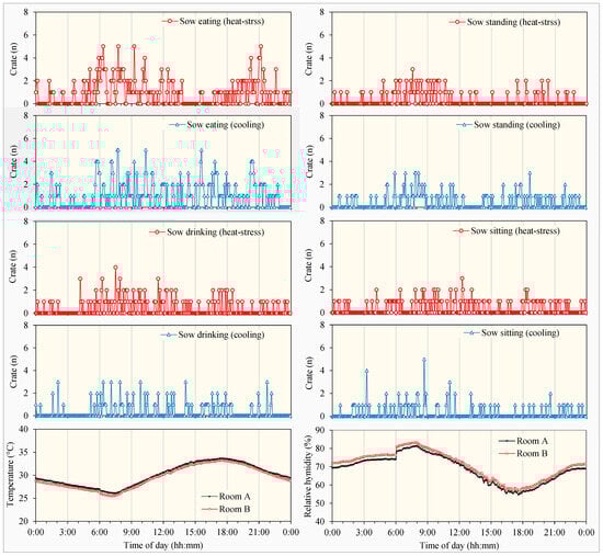 Visually observed numbers of pens where sows were eating, drinking, standing, and sitting at different times of the day under heat stress (charts with red curves) and cooling (charts with blue curves) compared with room temperature (bottom left) and relative humidity (bottom right) in the two rooms.
