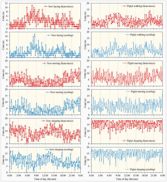 Upon analyzing the observation data, distinct differences were observed in the behaviors of sows subjected to heat stress and cooling treatments. There were substantial variations in circadian activity patterns in sow and piglet behaviors.