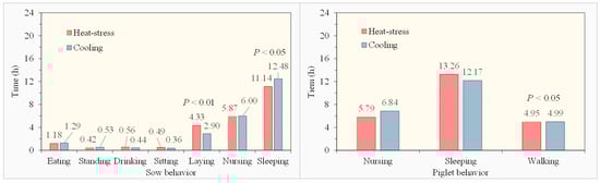 Comparison of different behaviors of sows (left) and piglets (right) between heat stress and cooling treatments.