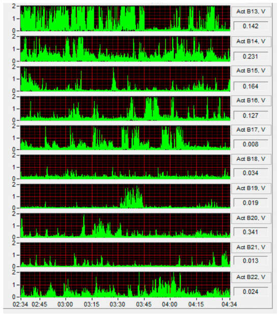 The sensors demonstrated a rapid response time (approximately 1 s) to the activities of the sow and piglets within the pen, quickly generating a voltage signal upon detection of movement. The sensors were also able to immediately lower the signal when the pigs ceased moving. The sensor outputs enabled high-resolution and real-time visualization of pig activity patterns, accessible both on-site and remotely, as depicted in the screenshot of the 2 h measurement history at 1 Hz (Figure 6).