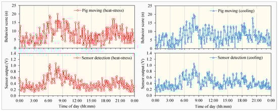 Comparison between the pig moving scores in visual observation data (top charts) and the corresponding sensor detection outputs (bottom charts) under heat stress (left-hand charts with red curves) and cooling (right-hand charts with blue curves).