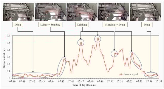 The sensor clearly distinguishes between the pig lying and standing. It produces low output below 0.1 V when the sow and piglets are lying between 07:40 and 07:45 in Figure 8. As the sow starts to stand at 07:45:10, the sensor output soars, peaking at 0.28 V within one minute. Then, the output soars even further to 0.57 V when the sow starts drinking at 07:46:55.
