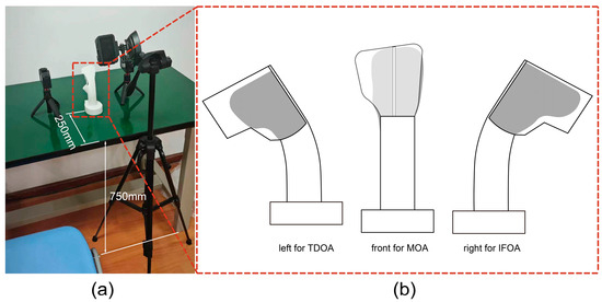 The experimental model was fixed in a specific position before the experiment to simulate a realistic joystick operation scenario, as shown in Figure 4a. The height of the operation table was set at 715 mm, in alignment with the standards for Chinese adult body size. The model was positioned 250 mm from the table’s edge. The experimental setup included three strategically placed cameras to capture diverse data points: Camera 1 was positioned horizontally on the left of the TDOA; Camera 2 was angled at 20° vertically, parallel to the MOA; and Camera 3 was set horizontally on the right of the TDOA.