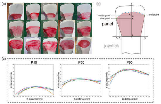 All 15 sets of experimental results are presented in the Figure 6a (P10×5, P50×5, P90×5). Distinct from the model’s base color, the painted areas have a clear boundary line and cover the bottom of the panel, indicating there is an upper limit of the thumb’s touch range in the MOA.