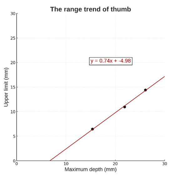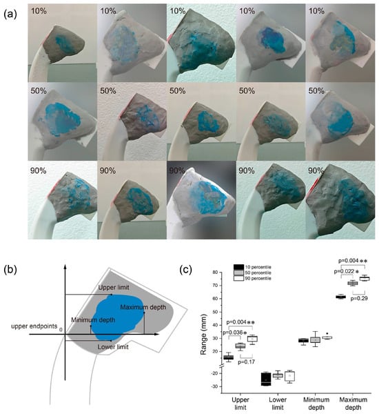 All 15 sets of experimental results are presented in Figure 8a (P10*5, P50*5, P90*5). There are thresholds in both vertical and depth directions for the thumb operation in this area. However, noteworthily, the minimum depth of every dye result is adjacent to the panel (see Figure 8b). Therefore, we exclude it in our following analysis. The Shapiro–Wilk normality test results were consistent with normality. As indicated in Table 2, statistical significances are found in the upper limit and maximum depth across different percentiles, while the lower limit does not show statistical significance.