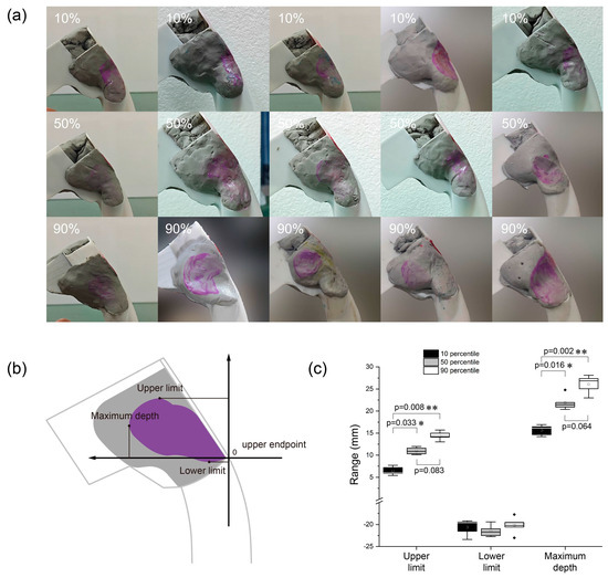Post hoc Tukey HSD results are shown in Figure 8c. Regarding the upper limit, there is a statistical significance between P10 and P50 (p < 0.05) and a higher level of significance between P10 and P90 (p < 0.01), whereas there is only a low assumption for the difference between P50 and P90 percentile (p < 0.1). And for the maximum depth, there is a statistical significance between P10 and P50 (p < 0.05), a higher level of significance between P10 and P90 (p < 0.01), and a slight significance between P50 and P90 (p < 0.1). With increasing hand length, the upper limit and the maximum depth increase, but its rate decreases.