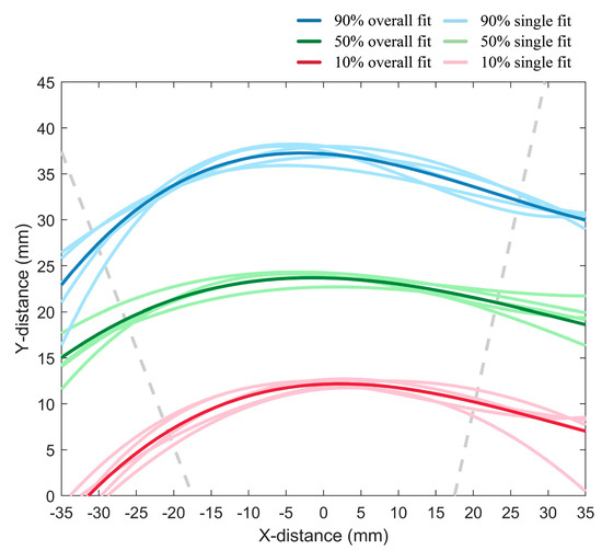 Results of overall fit to the P10, P50, and P90 percentile data. The gray dashed lines present the boundaries of both sides of the MOA, with 25° of vertical deflection on the left and 15° of vertical deflection on the right. The lighter lines present the results of the single fit for each percentile.