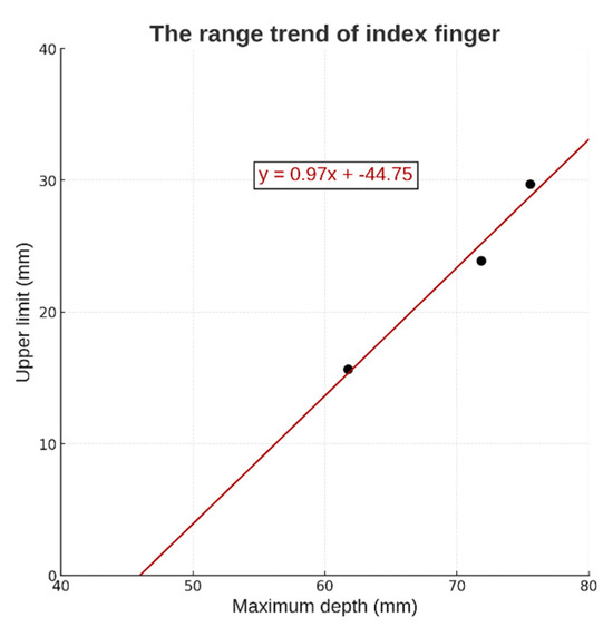 The upper limit and the maximum depth increase with hand length, indicating that the overall range of index finger operation expands with body dimension. However, no statistical significances were found between the lower limit and between the minimum depth across percentiles. This suggests the same incremental feature for operation range in this area as in MOA with overlap coverage.