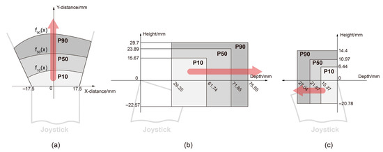 Based on the overall findings of incremental feature, the operation boundary of each percentile provides a graded reference for designing the joystick button layout in each operation area (see Figure 12): buttons that are complex in operation mode and require stability and safety should be prioritized within the area below the P10 boundary; button placement should progressively expand from the area of lower percentile to higher percentile based on the importance of functions and frequency of use; the P90 boundary curve should serve as the cutoff for button layout, as finger operations beyond this range will be difficult to achieve.