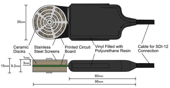 The water potential sensor used in this study [] measures both the matric suction, by using two porous discs (i.e., ceramic) with a known pore size distribution (fixed-matric), and the soil temperature, using a surface-mounted thermistor (Figure 1). In particular, the sensor indirectly measures the water content of the two ceramic discs (dielectrics) spaced apart by a printed electrical circuit board by measuring their electrical resistivity and then returns a suction value of the ceramic discs according to their water retention curve []. The obtained value of the suction of the ceramic discs is then supposed to be equal to the soil suction, considering that the water potential equilibrium is established between the sensor and the soil that is in contact with it. According to the manufacturer’s specifications, the sensor is calibrated at a saturated state (0 kPa), at a dry state equivalent to 105 kPa, and four calibration points between 0 and 100 kPa, resulting in an accuracy of ±10% of reading +2 kPa over the range of 5 to 100 kPa []. At high suctions, the accuracy of the sensor depends on the water retention property of the ceramic disc [], established based on mercury intrusion porosimetry []. The lower limit of the suction reading range for the sensor (i.e., 9 kPa) corresponds to the AEV of the largest pores in the ceramic discs. The operating temperature of the sensor is between 0 and 60 °C. A thermistor is located underneath the sensor overmold (resin) that enables monitoring of the temperature. The range, resolution, and accuracy of the temperature sensor are −40 °C to 60 °C, 0.1 °C, and ±1 °C, respectively [].