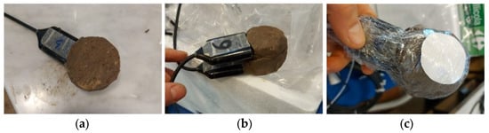 (a) Sensor inserts in the soil sample (test 1); (b) soil samples at the same initial water content put together at the end of the equilibrium time with (c) four filter papers attached to soil samples (test 2).