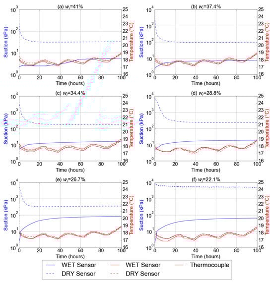 The temperature values recorded by the water potential sensor and the thermocouple during the suction measurements at the different water contents show that the measured temperature fluctuated within ±0.5 °C within a day (Figure 3). During the test, the temperature increased slightly due to the influence of the laboratory’s environmental conditions. Furthermore, temperature fluctuations had a minimal impact on the stability ranges, indicating that the stability ranges were primarily influenced by the initial water content rather than the temperature variations. The temperature measured with the TEROS 21 probes was found to range between 17 and 18.6 °C. In general, in the case of the initially wet sensors, the measured temperature was found to be higher than that measured when adopting the dry probes. However, for the water contents of 22.1%, the temperatures were always lower. The presence of water in the pores of the soil could justify this different thermal response of the probes in the different soil specimens. The comparison between the thermocouple and the TEROS 21 temperature measurements seems to be in good agreement with differences of ±0.25 °C. It is worth noting that the temperature values of the thermocouple were almost always under the temperature values of the sensor at the higher water content of 41% (Figure 3a). On the other hand, the temperature values of the thermocouple were almost always over the temperature values of the sensor at the low water content values, e.g., 22.1% (Figure 3f).
