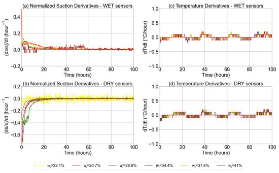 The normalized derivative shown in Figure 4a,b represents the relative rate of change in suction over time. For the initially wet sensors, the initial rates of change were higher, reaching up to 0.5 h−1, indicating a rapid increase in the suction, initially. The rate of change decreased faster for the higher initial water contents, suggesting that the higher water content led to quicker stabilization. For the initially dry sensors, the initial rates of change were lower, down to −0.75 h−1, indicating a decrease in suction, initially. The magnitude of change was larger for the higher water contents, resulting in more significant changes. The stabilization process was more gradual compared to that of the wet sensors, indicating a slower equilibration process. The temperature derivatives in Figure 4c,d show that, for both sensors, the temperature fluctuations ranged between −0.25 °C/h and +0.25 °C/h. For the wet sensors, larger temperature variations were logged for the higher initial water contents in the specimens, indicating a correlation between the water content of the specimen and the temperature changes. For the dry sensors, more pronounced temperature spikes were observed during initial drying, indicating significant thermal responsiveness in the measurement. The temperature fluctuations decreased as the equilibrium was approached, showing a trend toward stabilization.