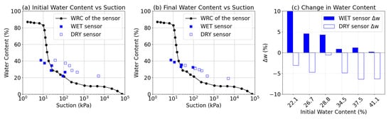 Figure 5c shows the variation in the water content from the initial samples before the test, and the water content obtained at the end of each test. The results show that, while using a wet sensor, the amount of water in the sample was increased; when using a dry sensor, the amount of soil water in contact with the sensor was found to decrease, as expected. For the wet sensor, the water content ranged from +0.2% to +10%. The most significant changes were observed when water content was less than 28%. In contrast, the dry sensor exhibited water content changes ranging from −0.4% to −6.3%. Larger changes were observed at higher suctions, indicating that the dry sensors were more responsive in conditions with lower suction.