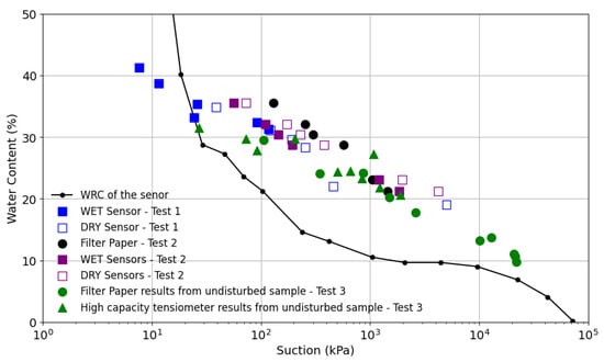 Comparing the results obtained by means of TEROS 21 for both test 1 and test 2, with the FP and HCT measurements on undisturbed samples, some differences can be observed. All the techniques were found to give reasonably good and consistent measurements for the undisturbed samples for suction values higher than 100 kPa (Figure 7). However, with high water content values, the measurements obtained with the HCT tended to be lower than those obtained from the TEROS 21, i.e., the HCT provided smaller values for suction. This is potentially due to, again, the retention properties of the ceramic discs of the TEROS 21. Specifically, at high water contents, a substantial change in the water content of the discs resulted in only a minor variation in the suction value. Indeed, the WRC of the porous stones became nearly vertical for suction values between 1 and 30 kPa.