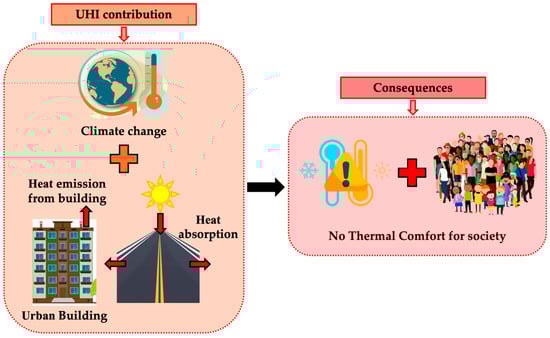 This thermal rise increases energy demand in urban buildings, especially for air conditioning, significantly impacting energy consumption and citizens’ well-being [4,5]. Furthermore, the lack of thermal control in indoor environments can compromise quality of life, reducing productivity and increasing health problems [6]. Developing effective strategies for improving thermal comfort in urban buildings and mitigate UHI is a priority for modern cities [2,4] (Figure 1).