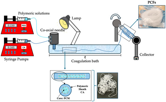 Among the PCFs’ production steps, optimising the coagulation bath is fundamental [14,19,20], as it directly influences the fibre sheath-core structure’s formation, integrity and functionality. Aneem T. et al. [21] studied how the coagulation process can control the exchange rate between the solvent and the coagulant, affecting the final morphology of the fibres, such as the thickness of the sheath and the uniformity of the core. Recent studies indicate that different parameters such as temperature, composition and length of the coagulation bath play essential roles in obtaining high-quality PCFs [21,22]. An optimised coagulation bath promotes the removal of toxic solvents, such as dimethylformamide (DMF) [14,23], improving the structural stability of the fibres and reducing environmental risks. Furthermore, this step is essential to avoid defects, such as ruptures, which could compromise the encapsulation of PCMs and their thermal storage capacity, ensuring their efficiency for long-term applications in civil engineering materials. Therefore, the appropriate choice of the best coagulation bath is essential for the overall performance of PCFs and their application in sustainable thermal regulation solutions.