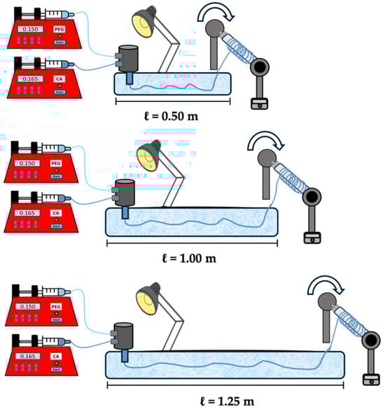 Before the production of PCFs, Funi and Fhol composed of CA (Mn 50,000, 10 wt.%) were produced. To optimise the production of PCFs incorporated with PEGs, an initial study was carried out focusing on the removal of the DMF solvent, which, in addition to having toxic properties, can pose risks in applications of civil engineering materials, as it may affect the mechanical integrity of the structures. In addition, an optimised bath is essential for coagulating the CA sheath, which is responsible for protecting the PEGs ejected into the core. Therefore, various coagulation bath lengths (Figure 3) of 0.50, 1.00, and 1.25 m were tested to mitigate these effects. The Funi and Fhol used at this time were named Funi_50, Funi_100, Funi_125, Fhol_50, Fhol_100, and Fhol_125. The values of 50, 100, and 125 correspond to the bath sizes.