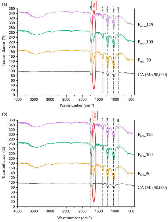 The characteristic peaks of the ATR-FTIR transmittance spectra for CA and DMF were identified for each Funi and Fhol sample to calculate the area index [26,27]. The analyses prioritised the areas rather than the band heights. Specifically, the functional and structural indices were determined based on the calculated valley-to-valley band areas using the ratio between the area of the DMF peak (1657 cm⁻1), represented by A(1657) corresponding to the carbonyl area peak (AC=O) and all the characteristic peaks in the spectrum. These area peaks included the area of the DMF peak and the area of all the CA peaks, represented by ∑A. This process is described in Equations (1) and (2):