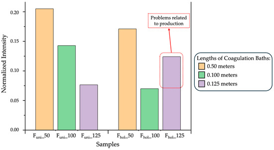 The bar graph in Figure 5 represents the index calculated for the fibres (Funi_50, Funi_100 and Funi_125) and (Fhol_50, Fhol_100 and Fhol_125) produced in the different coagulation baths.