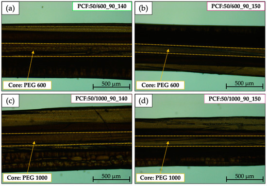 Micrographs of the morphology of PCFs obtained by Bright-field microscopy, with a magnification of 5×. (a) PCF:50/600_90_140; (b) PCF:50/600_90_150; (c) PCF:50/1000_90_140; (d) PCF:50/1000_90_150.