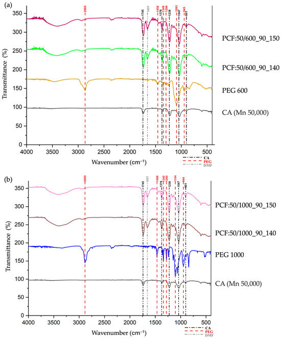ATR-FTIR spectra of the PCFs. (a) PCF:50/600_90_140, PCF:50/600_90_150, pristine materials CA (Mn 50,000), and PEG 600; (b) PCF:50/1000_90_140, PCF:50/1000_90_150, pristine materials CA (Mn 50,000), and PEG 1000.