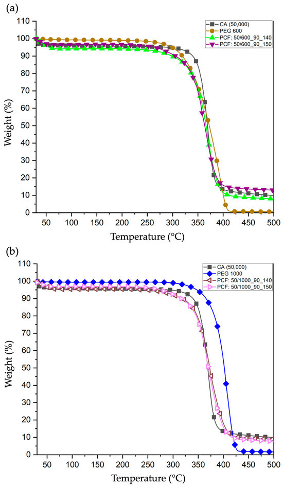 TGA curves were obtained from 30 °C to 500 °C under an N2 atmosphere, a calibrated flow rate of 200 mL/min and exposed to a heating rate of 10 °C/min. (a) Pristine materials (CA and PEG 600) and PCFs 600; (b) Pristine materials (CA and PEG 1000) and PCFs 1000.
