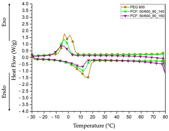 DSC curves of the pristine materials (CA and PEG 600) and PCFs 600, obtained from 80 to −30 °C under an Ar atmosphere, a calibrated flow rate of 50 mL/min, and exposed to a heating/cooling rate of 10 °C/min.