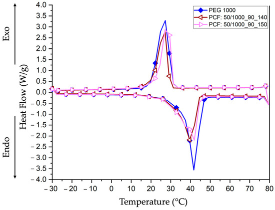 Regarding the results for PEG 1000 (Figure 10) and (Table 2), the analyses showed an initial melting temperature of 41.24 °C and an enthalpy of 93.62 J/g, indicating a result with more excellent thermal stability compared with that presented for PEG 600 due to its larger polymer chains and crystallinity [25,44]. The PCFs with PEG 1000 (PCF: 50/1000_90_140 and PCF: 50/1000_90_150) exhibited melting temperatures of 40.32 °C and 41.13 °C and enthalpies of 83.47 J/g and 88.88 J/g, respectively. Although the melting temperatures suffered a slight decrease, the influence of dH2O will be minor for the crystalline structure of PEG 1000 because the material presents longer and more stable polymer chains, which result in enthalpy values relatively close to those of the pristine material [39]. In the cooling phase, PEG 1000 presented a crystallisation temperature of 26.59 °C and an exothermic (exo) enthalpy of 112.96 J/g [25]. Meanwhile, the PCFs exhibited slightly higher crystallisation temperatures of 26.95 °C and 28.35 °C, with enthalpies of 84.66 J/g and 88.79 J/g, respectively. This behaviour can be attributed to the encapsulation process of PEG 1000 in these PCFs, stabilising the nucleation and alignment of the PEG polymer chains, resulting in a slight increase in the crystallisation temperature [48].