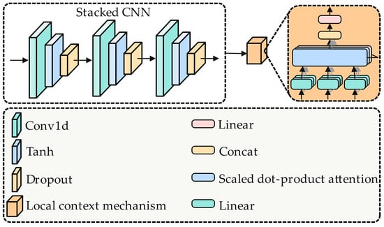 As shown in Figure 3, in this study, we first use a three-layer stacked CNN to learn local semantic features . Subsequently, the local context mechanism module employs the multihead self-attention mechanism to capture the local context semantic representation [6,25,26]: