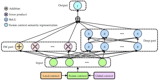 In terms of the deep factorization machine with the fusion context mechanism component, in the present study, we introduce a comprehensive end-to-end learning framework, DeepFM, into the recommender system field, which is capable of concurrently grasping both low- and high-order feature interactions [28]. As shown in Figure 5, by improving its input and output design, a fusion context mechanism suitable for information fusion field is developed, marking the first application of DeepFM for model fusion. This approach effectively fuses local and global context semantic representations, resulting in a fused context semantic representation. There are two main parts of DeepFM: the factorization machine module FM and the deep module DNN. The factorization machine module is used to capture low-order (first- and second-order) feature interaction relationships, while the deep module specifically addresses the capture of high-order feature interaction relationships. The process unfolds as follows [28]: