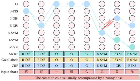 As shown in Figure 6, in this study, we introduce an MCRF, which can effectively address the occasional illegal tag sequence generated by the traditional conditional random field. This method is both easy to implement and achieves performance improvements over traditional CRF with little additional cost [29]. For a given input data sample sentence , its predicted tag sequence path can be expressed as ; the scoring process is as follows: