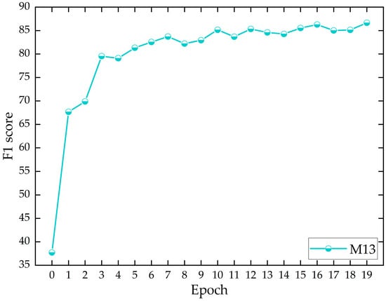 The effect of the number of epochs on the F1 score during a single experimental cycle. M13 represents our proposed approach.