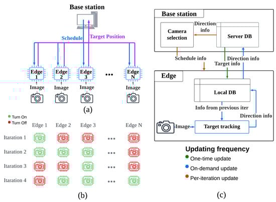 The TEDDY framework consists of two primary components: the base station and the distributed edge devices, as illustrated in Figure 2a. The base station serves as the central control unit and is responsible for scheduling, coordination, and maintaining global tracking consistency. Edge devices are distributed across the system and perform localized target tracking using lightweight processing algorithms. The system operates in iterative cycles, with the base station and the edge devices collaborating to optimize tracking performance and resource efficiency.