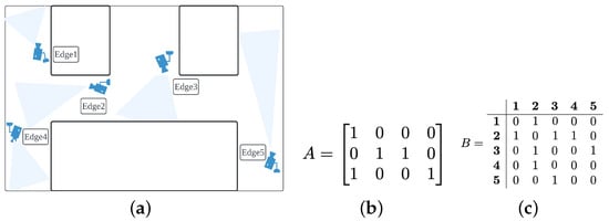 (a) The top view of a camera network. The positions of the cameras in (a) were modeled on an matrix (), as shown in (b). The locations marked with “1” in (b) were treated as nodes, and the adjacency matrix of matrix A was then represented in (c) as matrix B.